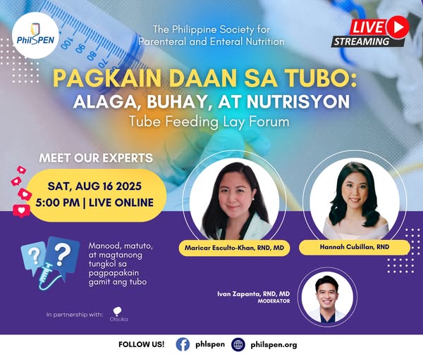 May kamag-anak ka bang naka-tube feeding (NGT o PEG)? ? O kilala ka bang pamilya na may inaalagaang pasyente na naka-tubo? ? ? Invite your friends, family, and patients to join this FREE webinar! Sama-sama nating pag-usapan ang myths, benefits, at practical tips tungkol sa tube feeding — kasama ang ating experts Dr. Maricar Esculto-Khan at RND Hannah Cubillan. ? Huwag kalimutan mag-comment ng inyong questions para masagot live ng ating experts! ? Libre at para sa lahat ? Follow PHILSPEN for updates and livestream link